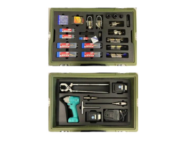 2.主要工具的构成:充电式电钻、套装改锥头、钥匙、专用螺钉、尖嘴钳、弯嘴钳、T形扳手、锤子、开孔器、钻头,中心钻旋转锉、垫板、开锁器、润滑油、充电锂电池、圆形定位套、充电器、微型切板机等。
